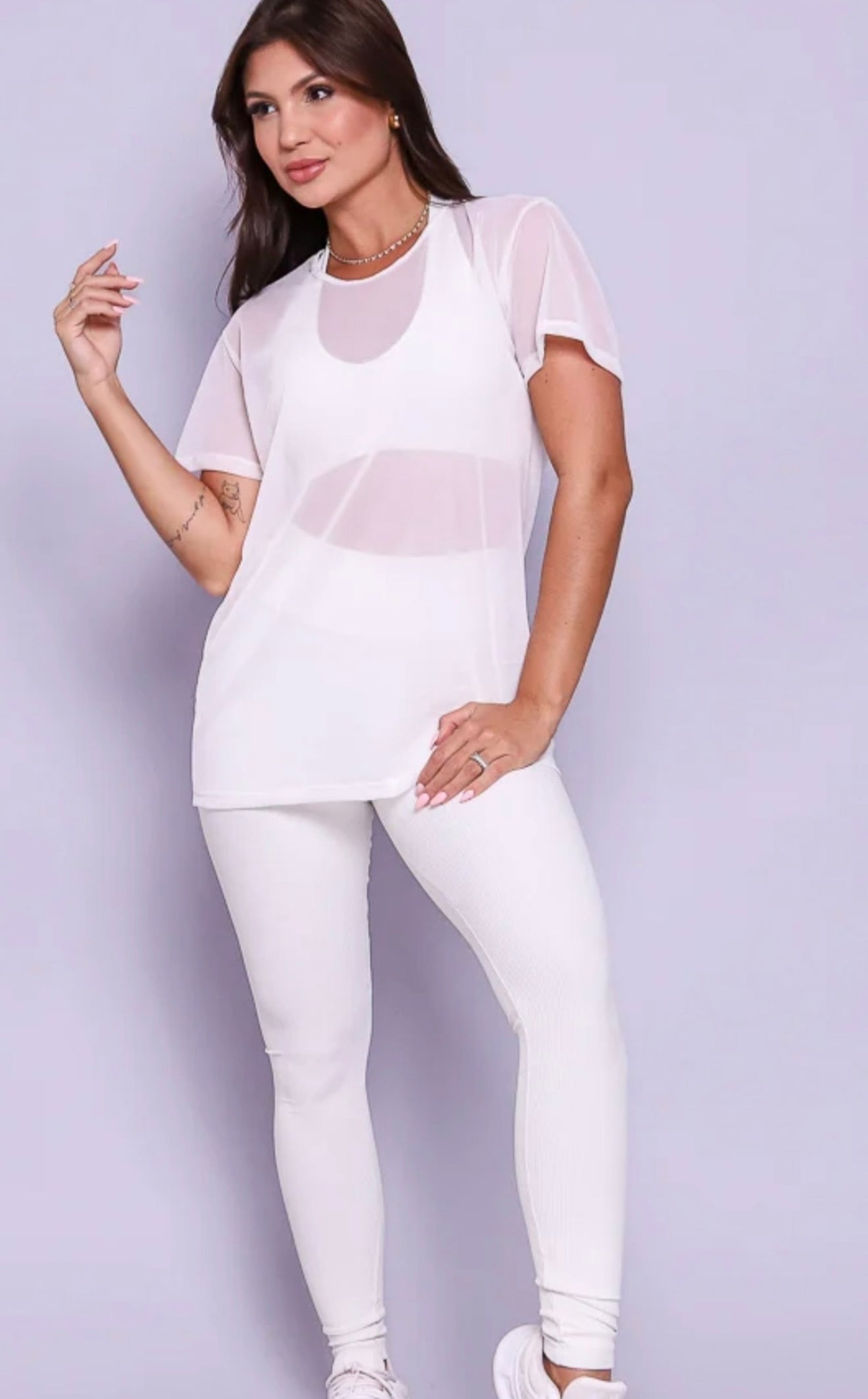 A breathable and elegant all-white activewear set from the ESSENTIALS Collection. Featuring a mesh cover top, it's perfect for light workouts or stylish layering. Soft, stretchy, and made for movement.
