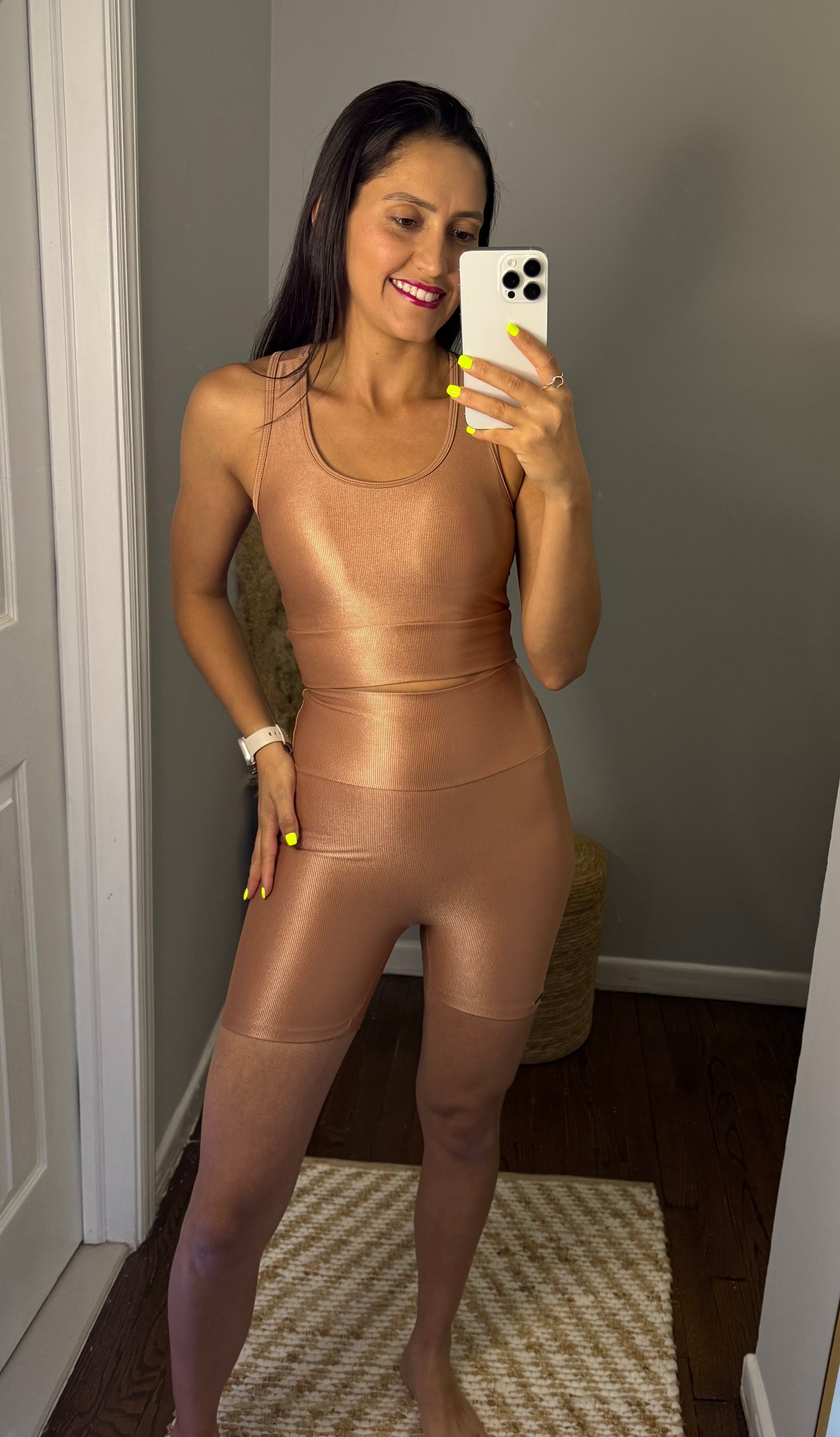Ribbed set featuring a sports bra and high-waisted shorts, designed with high-compression fabric. It provides comfort, support, and freedom of movement, perfect for workouts or casual wear. Modern design with a flattering fit that enhances your silhouette.